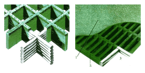 Continuous fiberglass roving is placed in the open, heated mold in alternating layers, wetted out thoroughly with resin. Such a process produce an integral, one- piece construction, which offers excellent corrosion resistance and bi-directional strength as well. The mould is heated to cure the panel after such a fiberglass-roving- weaving process. If embedded grit top surface is required for extra anti-slip, the mould will receive grit at this time before the panel is cured. Upon curing, the panel is ejected from the mould, and at this time, the panel will typically have a concave(meniscus) top surface for slip resistance. Should a standard applied-grit top surface is needed, a secondary operation follows, that is: the grit will be bonded to the top of the completed panel.